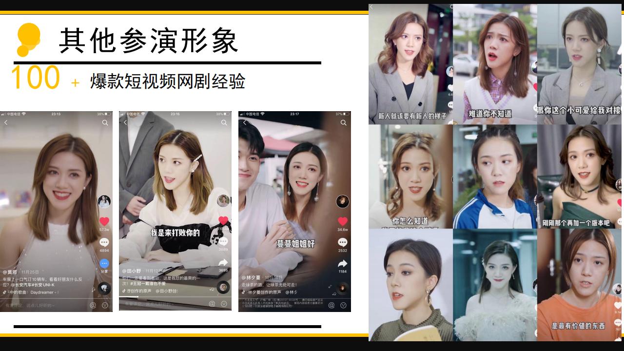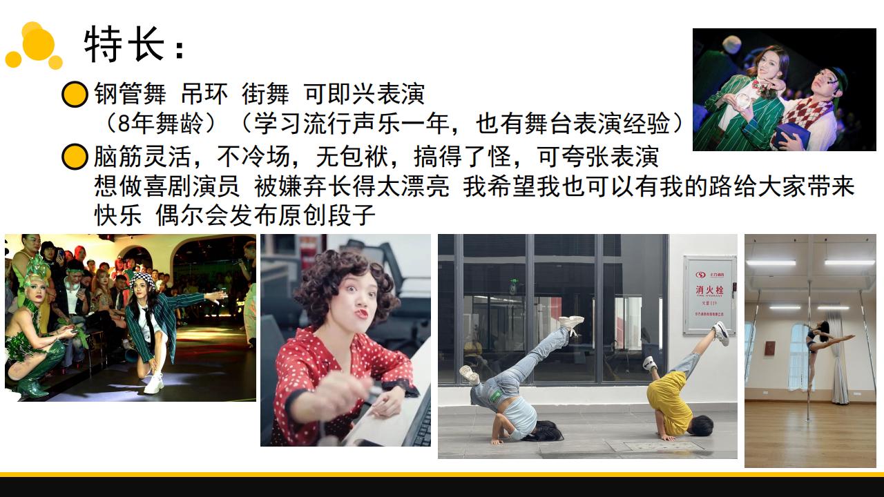 【個人簡介】運動型女演員 3年影視經驗 8年舞齡。體能好的沒我柔韌性強。擅長多種空中舞蹈 鋼管 吊環 綢緞 輕松橫叉豎叉 側手翻 下腰 倒立 也會街舞 能做地板動作 能吃苦